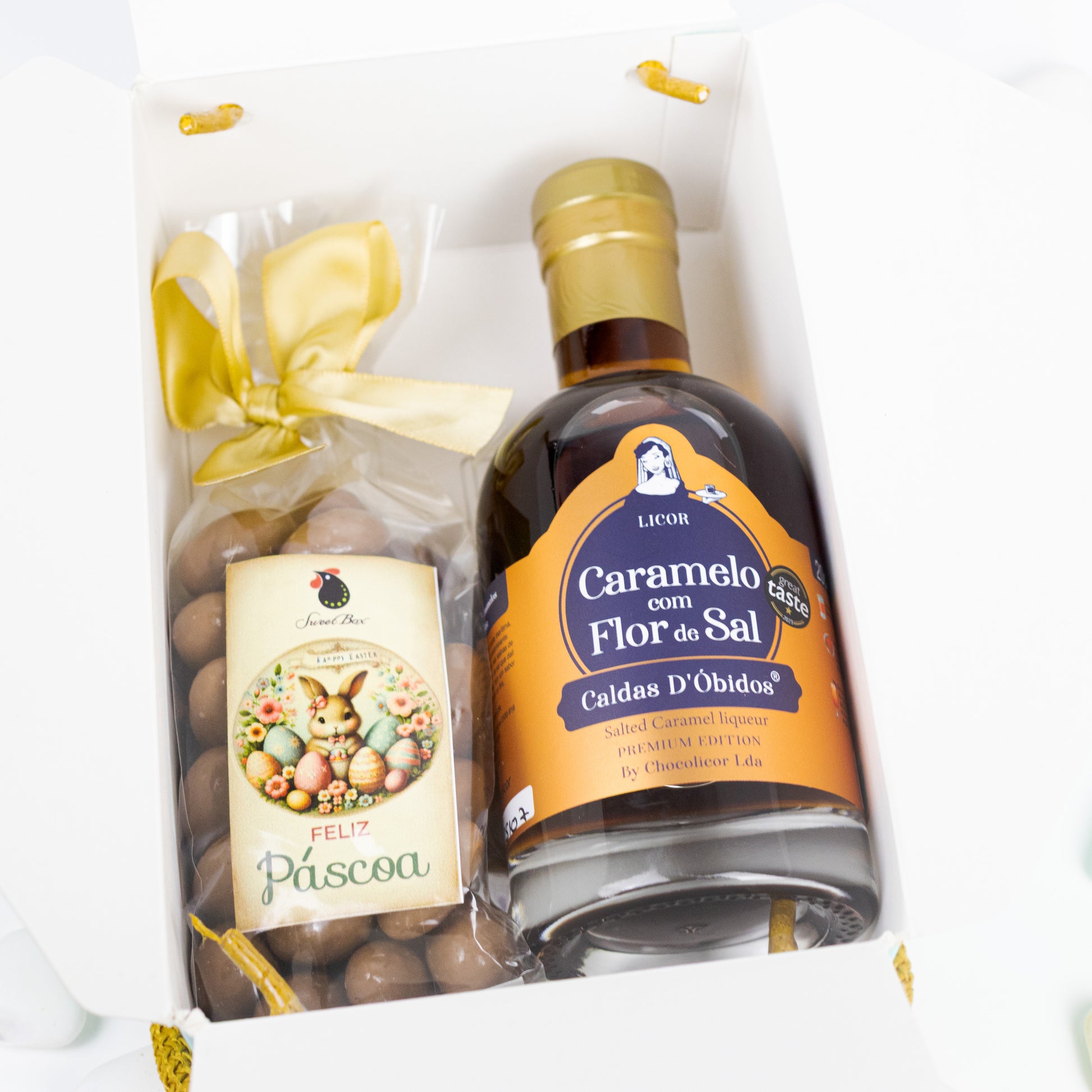 Pack constituído por: 1 licores premium de 200ml (Licor de Caramelo com Flor de Sal), 1 embalagem de 160 grs de amêndoas italianas de chocolate sortidas, 1 postal de Feliz Páscoa, acondicionado numa caixa de oferta.