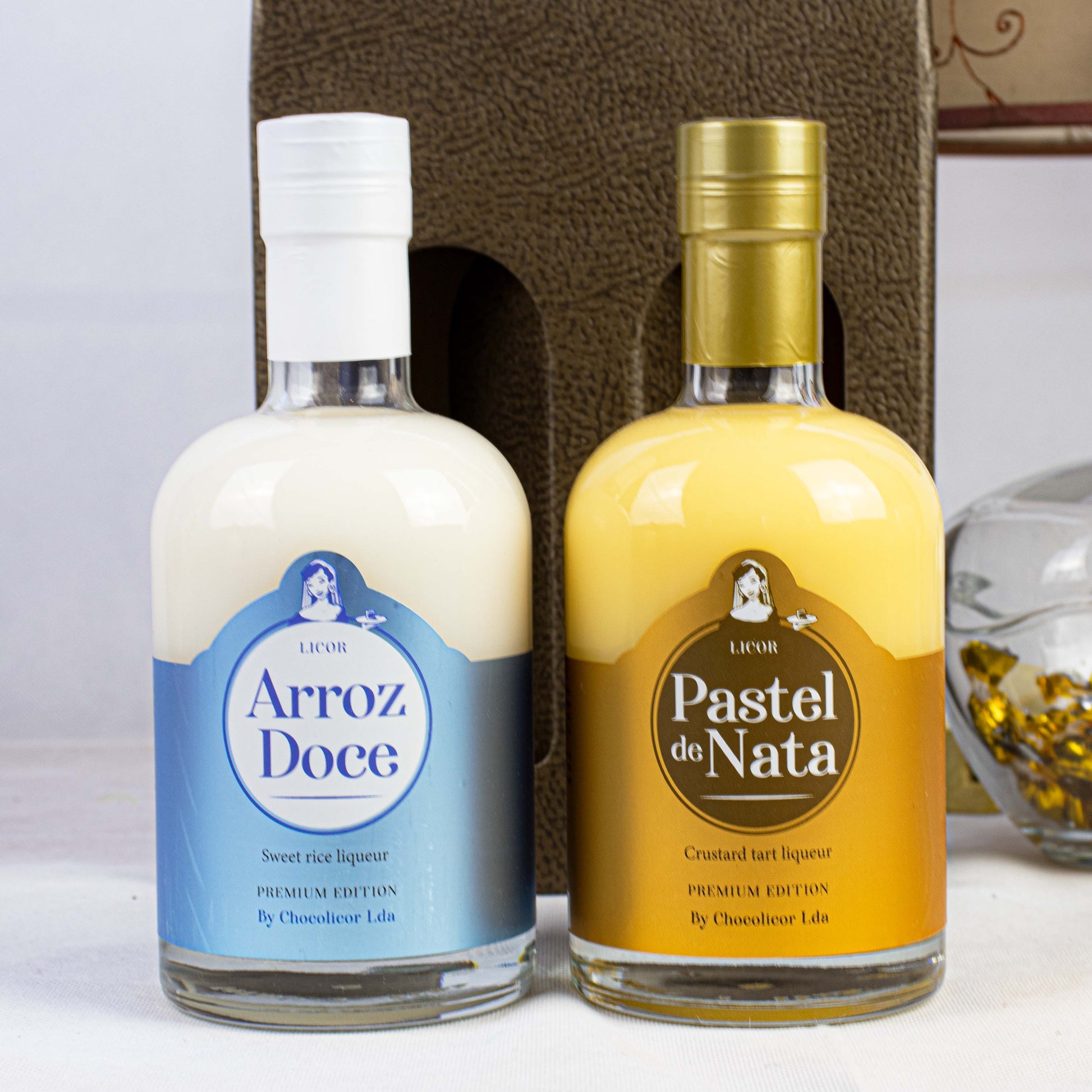 Portuguese Pack consisting of: Pastel de Nata Liqueur 500ml and Arroz Doce Liqueur 500ml, packed in a brown box.