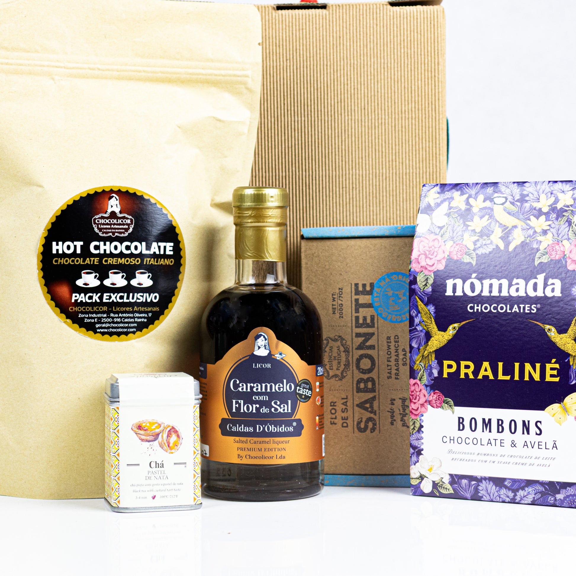 Pack constituído por: 1 licores premium de 200ml (Licor de Caramelo com Flor de Sal), 1 embalagem de 100 grs de chocolate praliné, 1 sabonete de flor de sal artesanal, 1 saco de pano estampado, 1 pack com 3 embalagem para preparação de chocolate quente italiano e uma latinha de chá de 25grs de pastel de nata, acondicionado numa caixa de oferta.