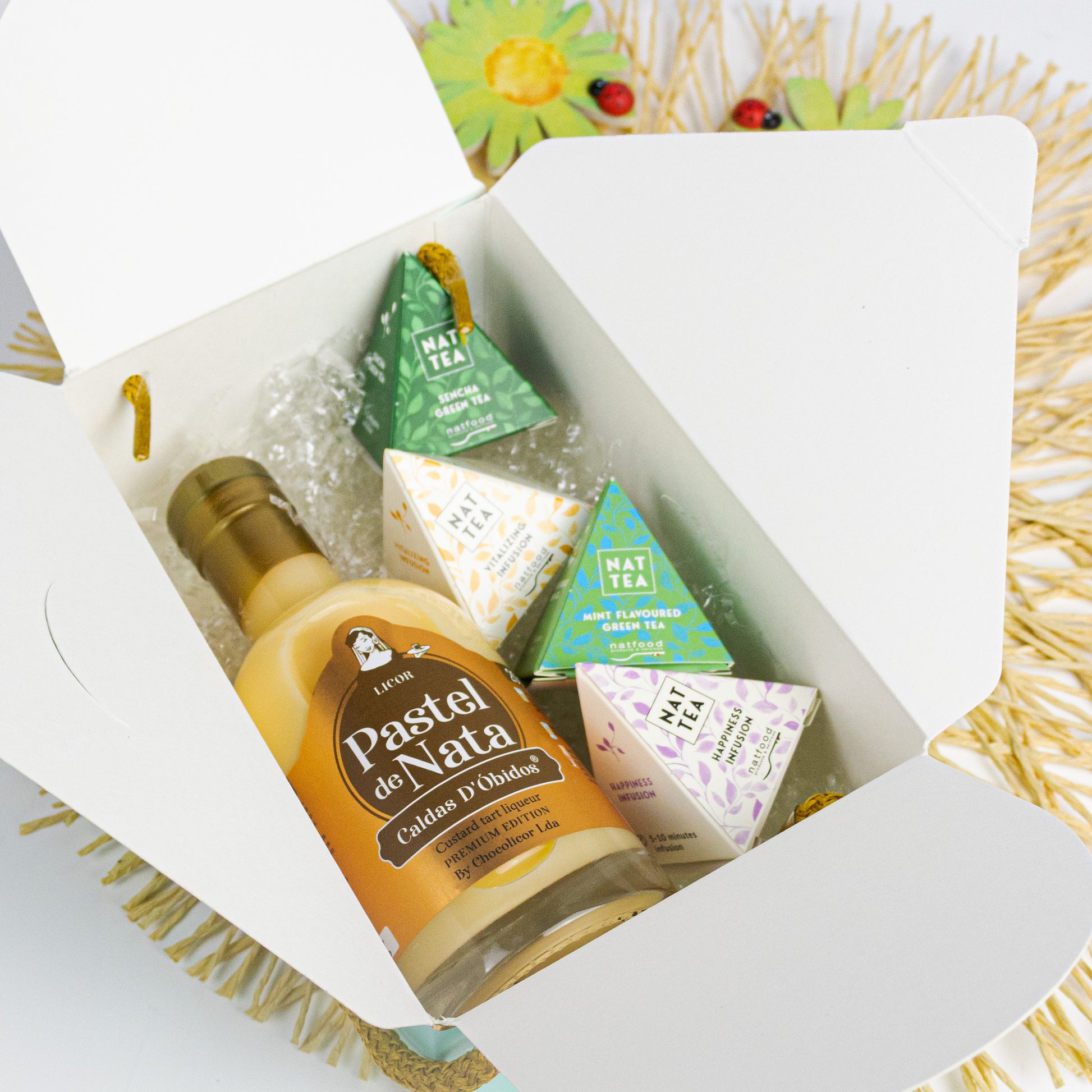 Pack constituído por: 1 licores premium de 200ml (Licor de Pastel de Nata) e 2 saquetas de chá ( Felicidade: Chá de rooibos com pedaços de frutas exóticas, como o abacaxi e mamão, combinado com baunilha e flores de calêndula; Vitalizante: Impulso de energia para todo o corpo. Sabor doce e vivo, perfume agradável, uma combinação perfeita de pedaços de maçã, abacaxi, mamão, goji, frutos vermelhos; Verde e sencha: trata-se dum chá verde de excelência com aroma herbáceo; Verde e menta: aroma fresco e vivo em que folhas de chá verde se abraçam com folhas de hortelã), acondicionado numa caixa de oferta.