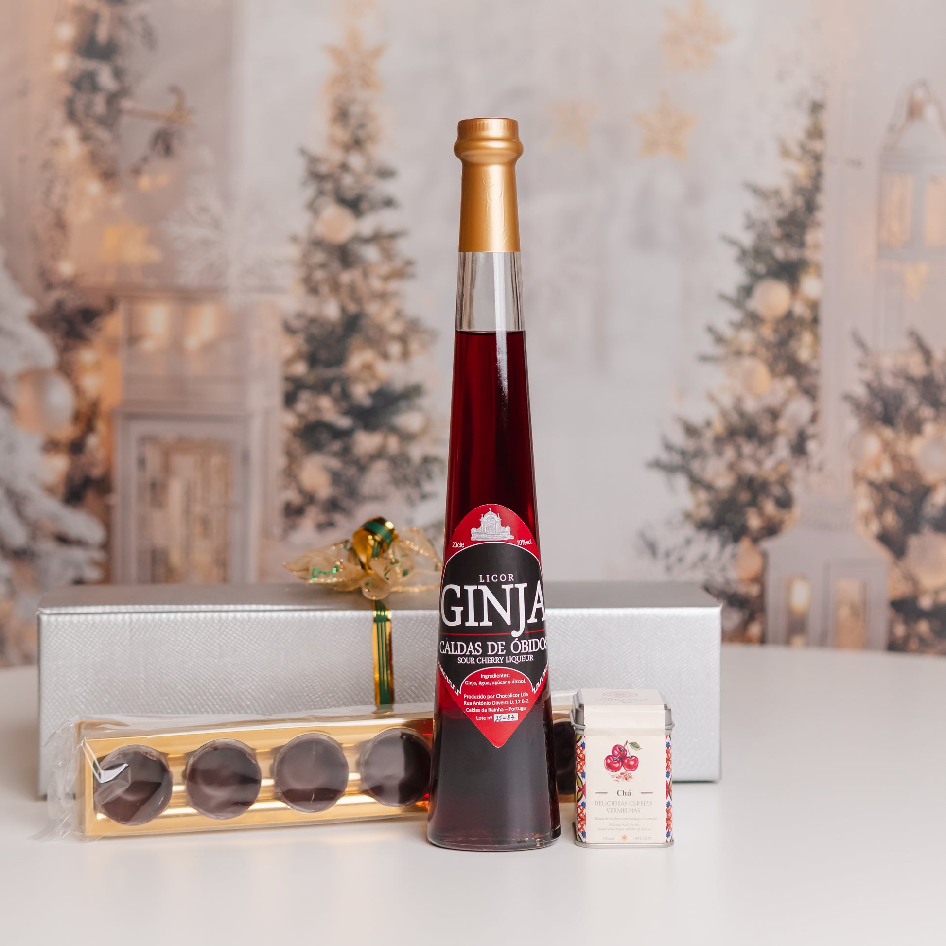 Baú de Natal constituído por : 1 licor de Ginja Caldas D'Óbidos 200ml, 1 embalagem de 6 copos de chocolate, 1 latinha de chá de cereja com 25gr da Piacere, acondicionados numa caixa presente baú.