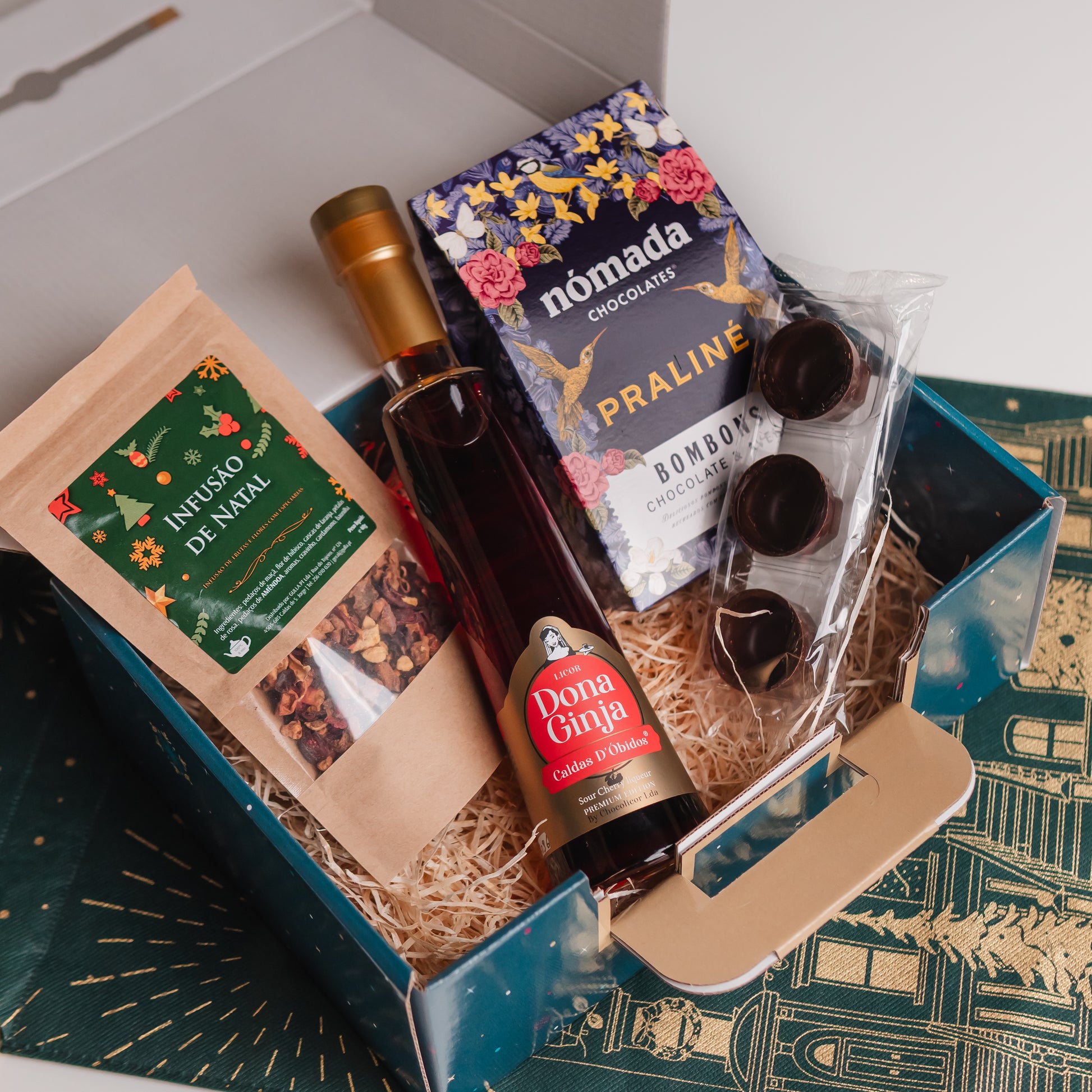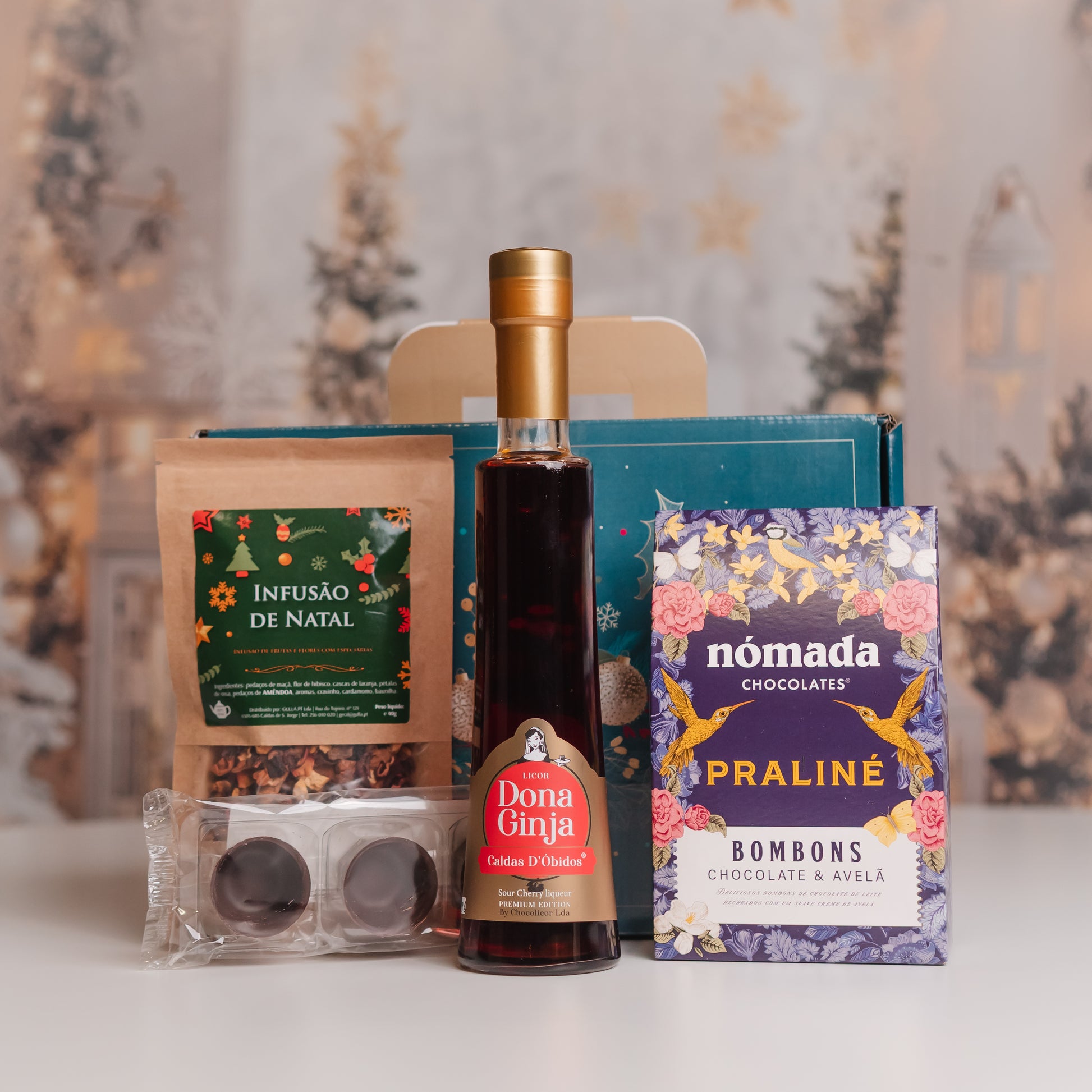 Cabaz de Natal c/ Ginja constituído por : 1 licor de Dona Ginja 200ml, 1 caixa de bombons Praliné, 1 embalagem de 4 copos de chocolate, 1 saqueta de infusão de Natal com 40grs, acondicionados numa caixa presente.