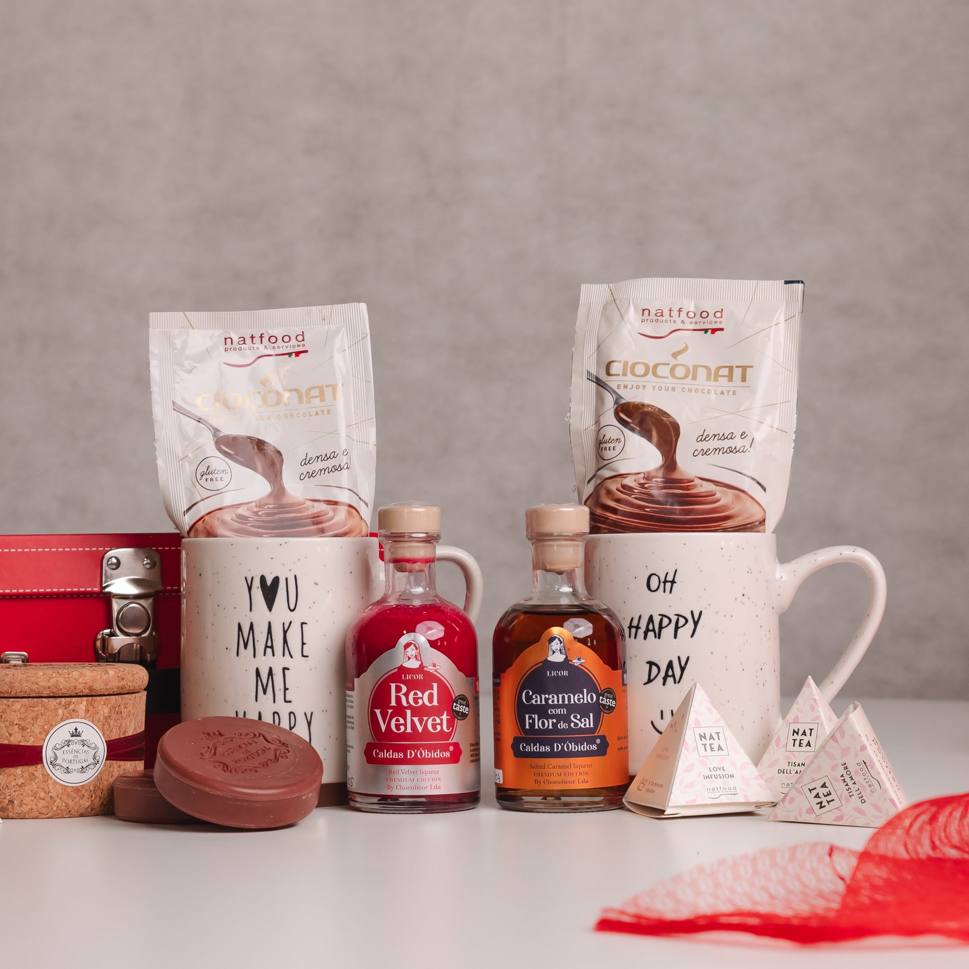 Pack constituido por: 1 licores Premium de 100ml (Licor Caramelo com Flor de Sal e Licor de Red Velvet), 2 canecas cerêmicas ilustradas, 1 guarda-jóias em cortiça natural com dois sabonetes artesanais de ginja, 2 doses de infusão do amor (mistura picante com gengibre,maçã,citronela. pimenta rosa, canela, casca de laranja e flores de calêndula e rooibos vermelho), 2 doses de infusão da felicidade (frutas exóticas, baunilha e flores de calêndula e rooibos), 1 embalagem de 30 grs de chocolate em pó italiano de caramelo salgado, 1 embalagem de 30 grs de chocolate em pó italiano, acondicionados numa mala vermelha.