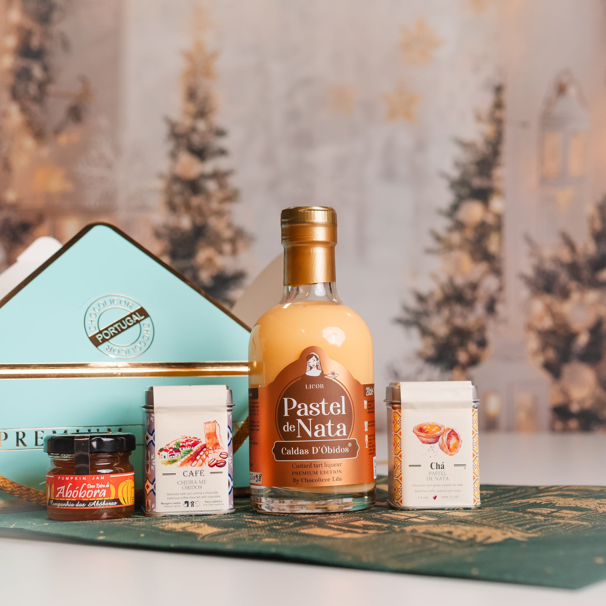 Mini Cabaz de Natal constituído por : 1 licor de Pastel de Nata 200ml, 1 latinha de chá de pastel de nata com 25grs da Piacere, 1 latinha de café moido com 25grs da Piacere, 1 mini compota sortida com 50grs, acondicionados numa caixa presente.